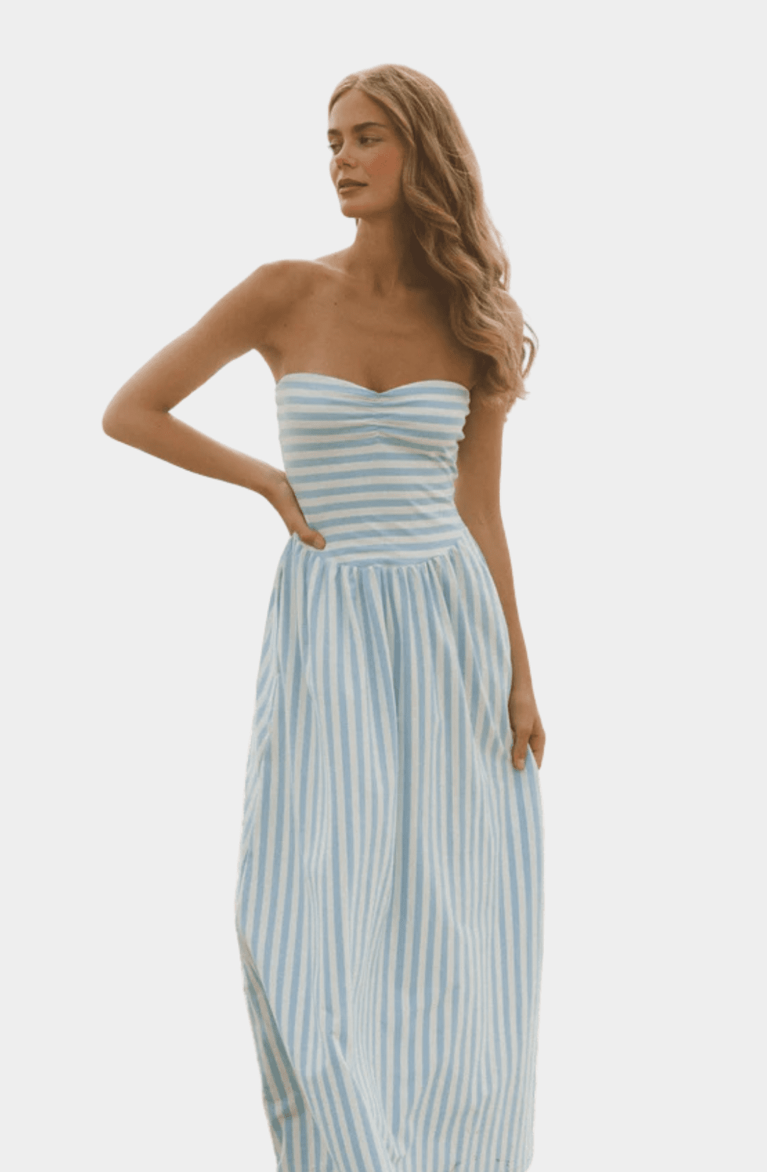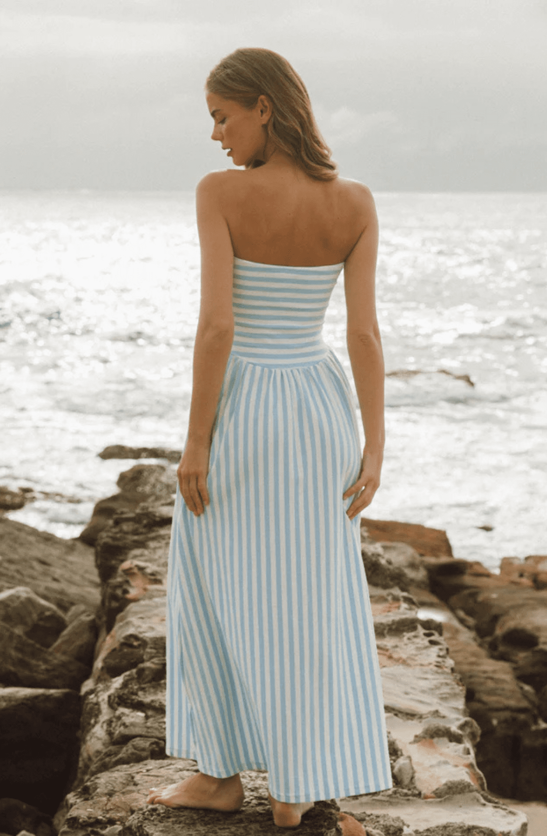 Designed with a strapless neckline and soft vertical blue and white stripes, the Sirmione Maxi Dress offers an effortless balance of structure and flow. A fitted bodice falls into a relaxed, full-length skirt, creating an easy yet elevated look. Light and feminine, it’s made for warm days, coastal escapes and understated summer dressing.