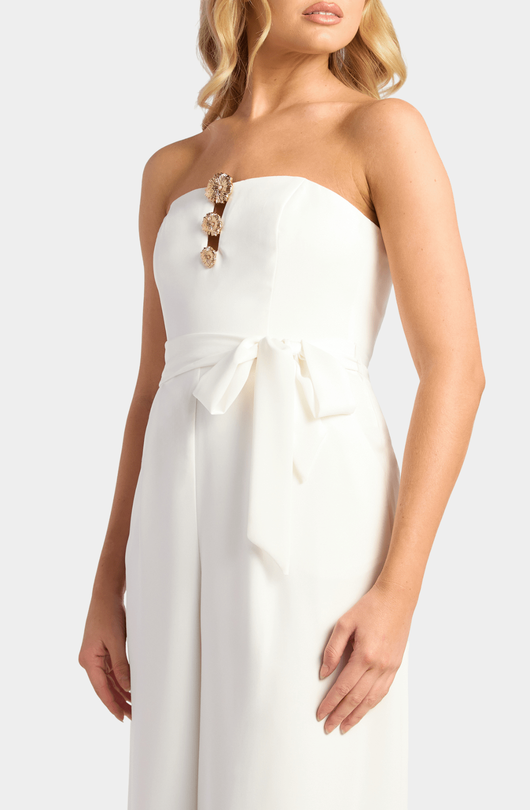 A strapless jumpsuit defined by clean lines and subtle detail. The Dion features a structured bodice, gold-tone accent, and wide-leg silhouette designed to sit effortlessly on the body. Understated, modern, and event-ready.