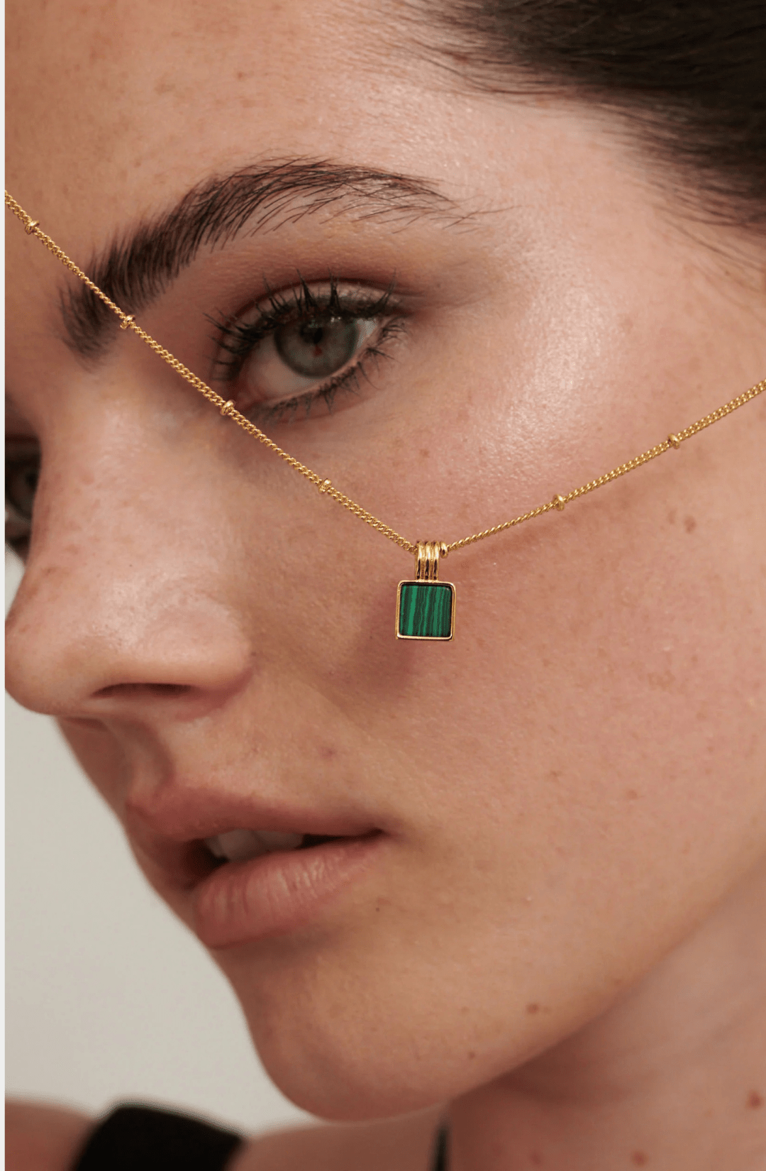 The Le Mar Necklace features a petite malachite-style pendant on a fine gold-toned chain, adding a refined touch of colour without overpowering your look. Its clean, delicate design makes it perfect to wear on its own or layered with your favourite gold pieces.