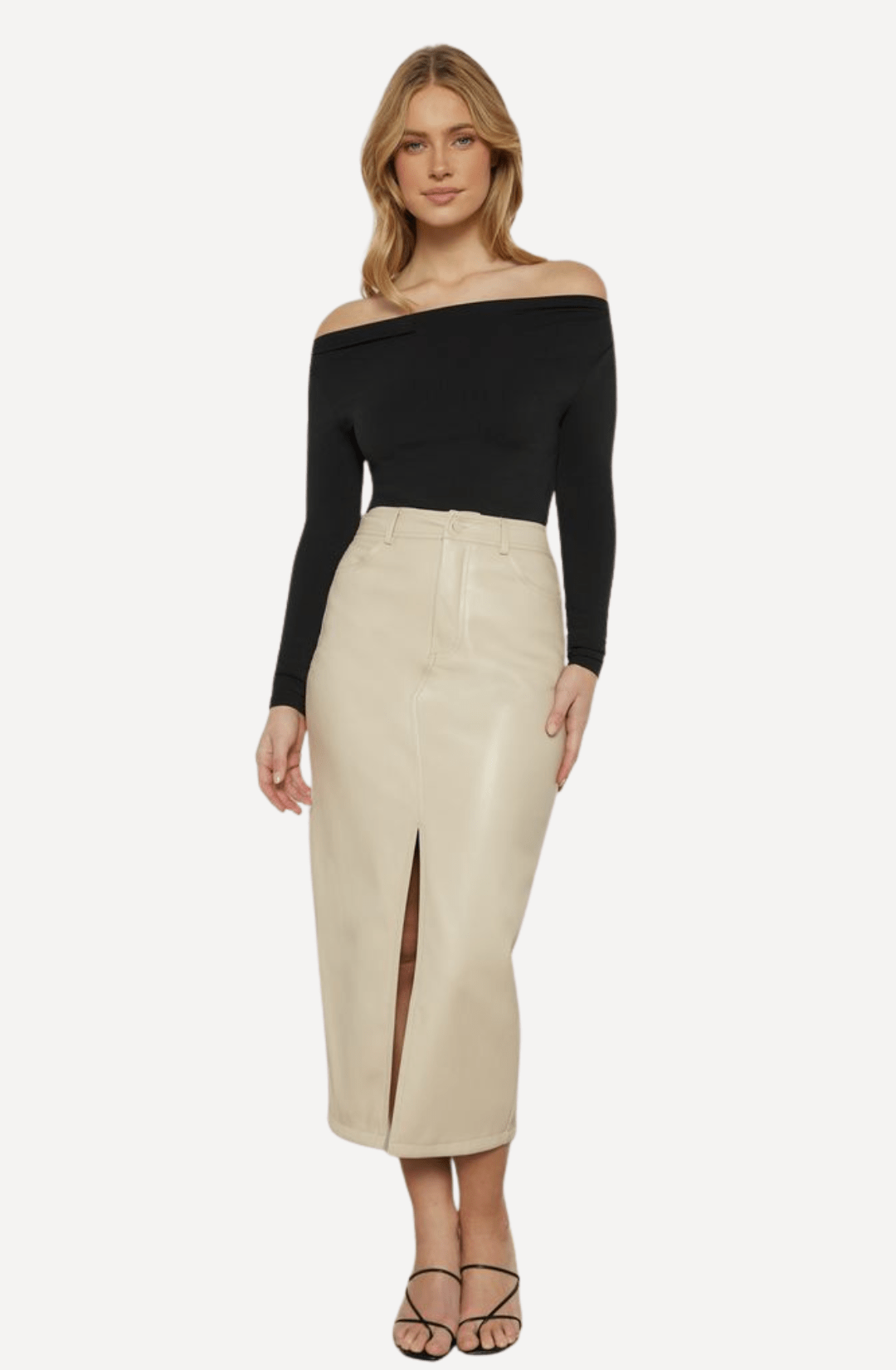 The Carolina Top features a sleek off-shoulder neckline that sits effortlessly across the collarbone, sculpting a flattering, feminine silhouette. Crafted from soft stretch jersey, it hugs the body with comfort and ease - perfect paired with tailored pants or a leather midi.